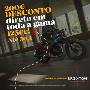 Ao escolher uma Brixton da gama 125cc usufrui de 200€ de desconto direto, desde a pequena e irreverente Crossfire 125 XS, até à exclusiva Rayburn 125, passado pelas populares Cromwell 125 e Felsberg 125, todas garantindo muitas e boas horas de diversão.