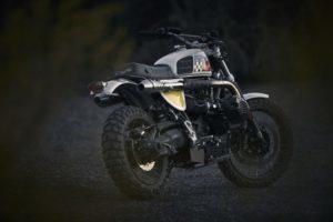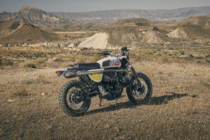 Os silenciadores do escape saem do cilindro para cima, invertidos face aos de série e finalizam em dois silenciosos cromados com saída elevada. Tudo respira um ar retro dos ano setenta, mas o motor e o chassis têm tecnologia moderna. O motor é um boxer da BMW Rnine T Urban G/S com 115 cv, refrigerado a ar.