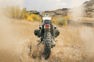 O depósito do combustível é de uma velha Suzuki GT250 e o banco é artesanal, plano, e foi sacado de uma Ossa Desert dos anos 70. O farol é retro pequeno e com grelha de proteção. Os pneus são Conti TKC80, guarda-lamas metálicos e cromados, luz traseira retro e outros detalhes que nos levam para os anos 70.