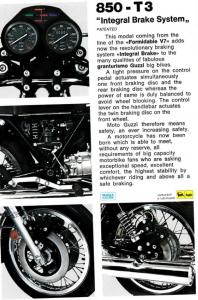 Termino com mais uma inovação da marca: a travagem combinada! Ficou conhecido quando a Honda lançou no mercado o seu sistema CBS (Combined Braking System) com a GL 1100 de 1983 (havemos de falar dela, mais à frente), depois popularizado pela sua CBR 1000. Porém, a verdade é que o sistema começou a ser comercializado logo em 1975 na Moto Guzzi 850 T3 como forma de reduzir as distâncias de travagem! Já agora, o T significava Turismo e o 3 dizia respeito ao facto de estar equipada com 3 discos de travão, neste caso da Brembo.