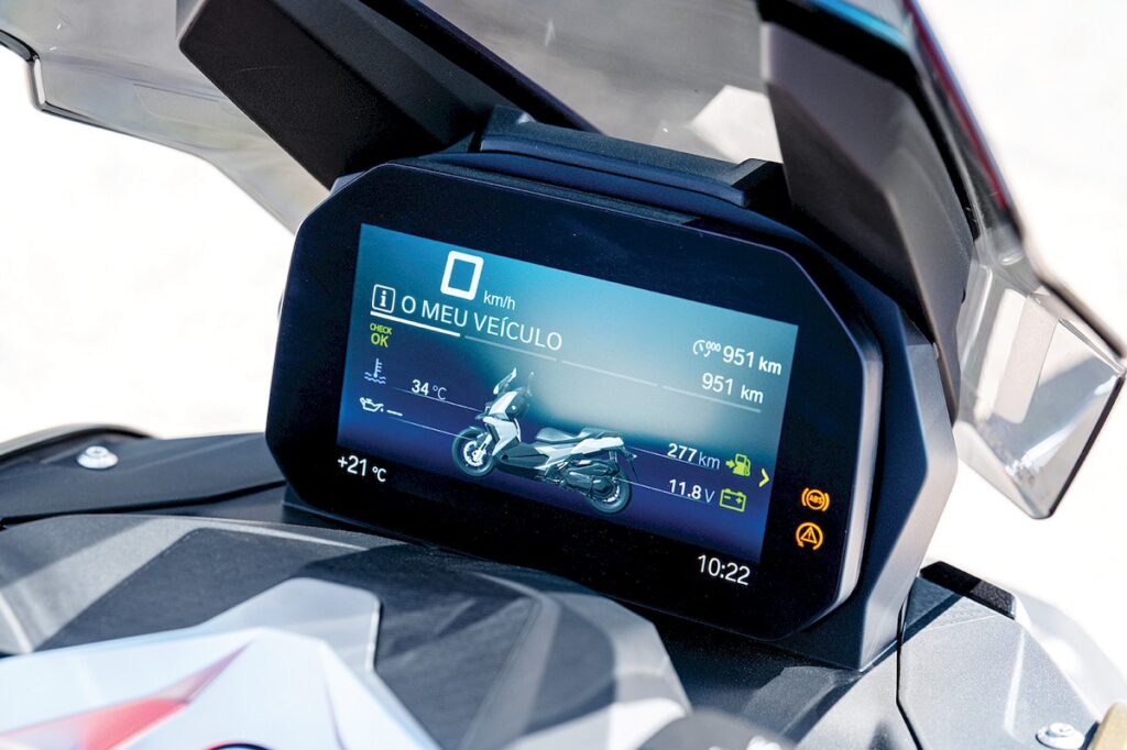 A BMW há muito que insiste no sistema Flexcase, um sistema debaixo do assento que permite acoplar um capacete integral… mas apenas com a moto parada. Ora, desta forma, não é possível circular com a Flexcase na sua posição estendida, o que reduz bastante a capacidade de transporte de carga. Poderá ter importância para quem transporta passageiro com frequência, ou vai às compras de scooter. E se esta “tecnologia” é o que estamos habituados a encontrar na marca germânica, o painel TFT acompanha esse hábito. Muito semelhante ao que está disponível nas motos de maior cilindrada da BMW, este painel de 6,5” oferece excelente visibilidade e muita informação ao condutor. Ainda assim, os temas de apresentação são bastante simples, sendo necessário navegar dentro do painel para acesso à informação mais completa. Ainda como equipamento de série, a C400 X está equipada com ABS Pro, controlo dinâmico de travagem, controlo de tração e controlo de binário. Para os que querem mais conforto, punhos e banco aquecido são dois dos acessórios disponíveis, numa lista enorme de opcionais que a BMW oferece.