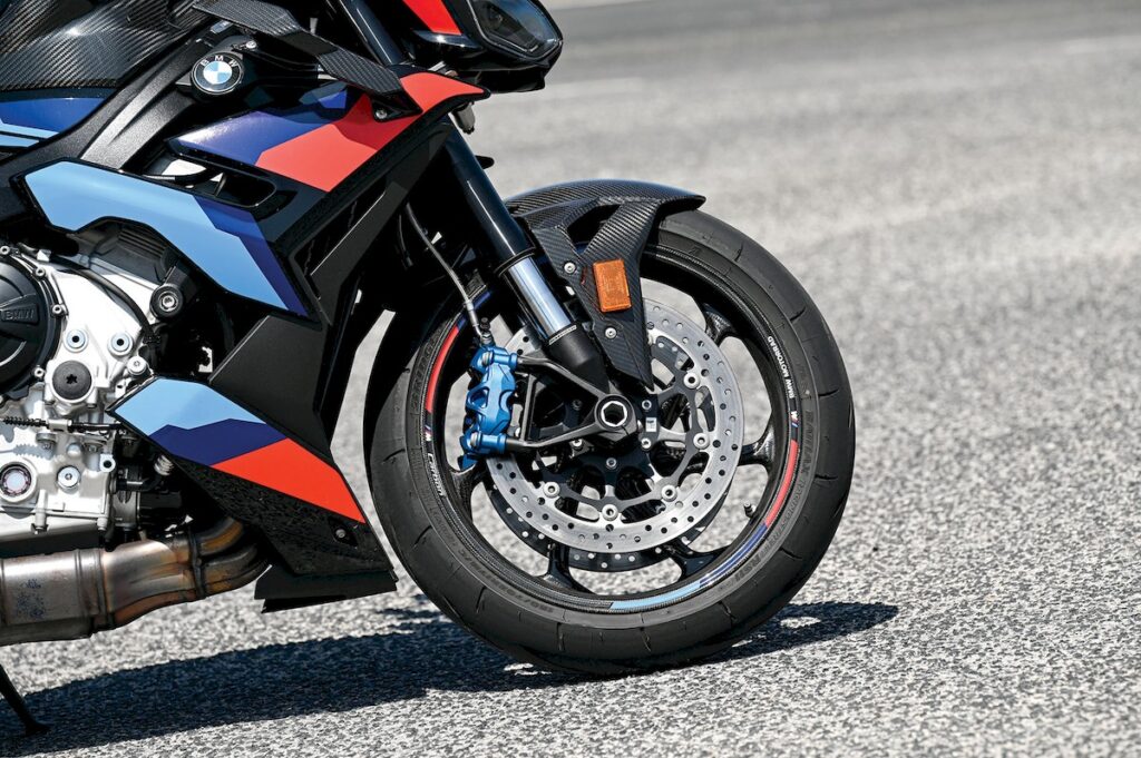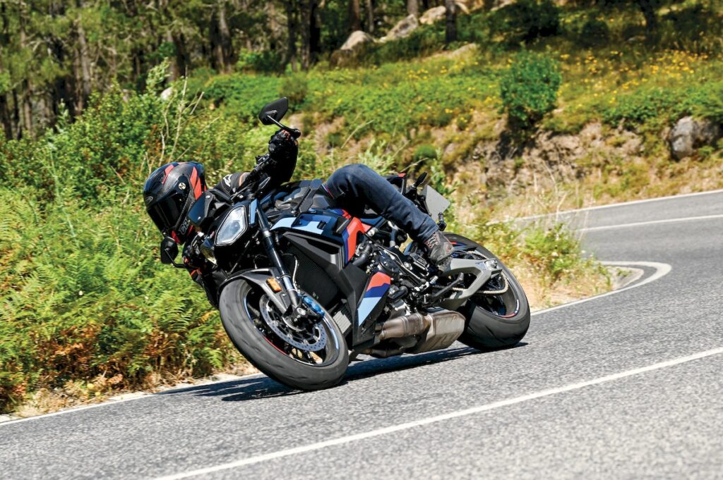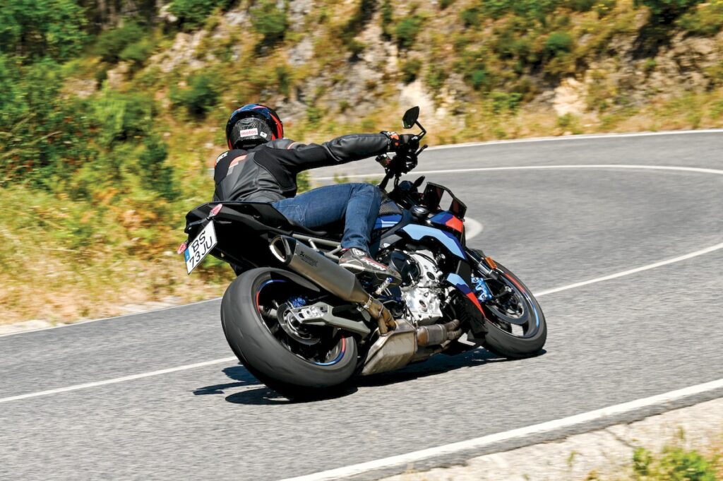 As ajudas eletrónicas não nos permitem entrar em caminhos mais apertados, mas transições de curva onde queremos aproveitar para utilizar o acelerador, podem tornar-se matreiras por reações mais inesperadas da frente. Mas se há um departamento onde não encontramos surpresas é na travagem. As pinças M e os discos de 300 mm oferecem um excelente tato e muita potência, entrando, potencialmente, para o topo da lista de motos com melhor travagem. Atrás o disco de 220 mm é também um ótimo complemento. Ciclísticamente a M1000 R está claramente pensada para uma condução mais desportiva e sentimos que o seu funcionamento ótimo é em regimes elevados.