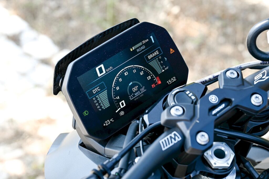 Contamos ainda com cinco modos de condução (Rain, Road, Dynamic, Race e Race Pro, este com 3 definições personalizáveis) bastante diferentes entre si, ainda que nenhum deles seja “amigável”. Mas é no Race Pro que estão todas as definições personalizáveis e apesar de não ser extremamente intuitivo chegar à personalizações, há depois muito por explorar e para “brincar” no TFT de 6,5”. Para nosso conforto, temos ainda punhos aquecidos, cruise control e um sistema de ignição keyless, todos bem vindos. E a melhor forma de elogiar a tecnologia é dizer que nunca sentimos que estivesse a atuar, à excepção de quando percebemos claramente que a roda dianteira não se eleva mais do chão, não por habilidade nossa, mas por uma eletrónica muito boa, que mesmo assim nunca impediu a nossa progressão.