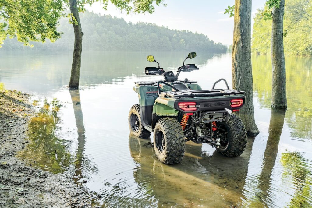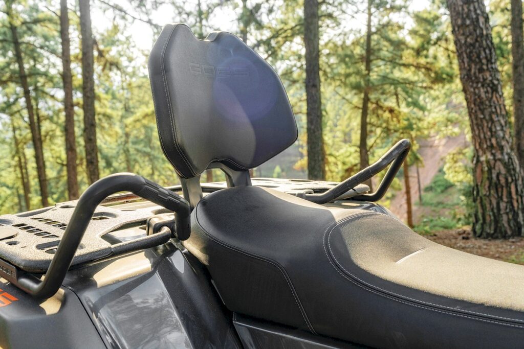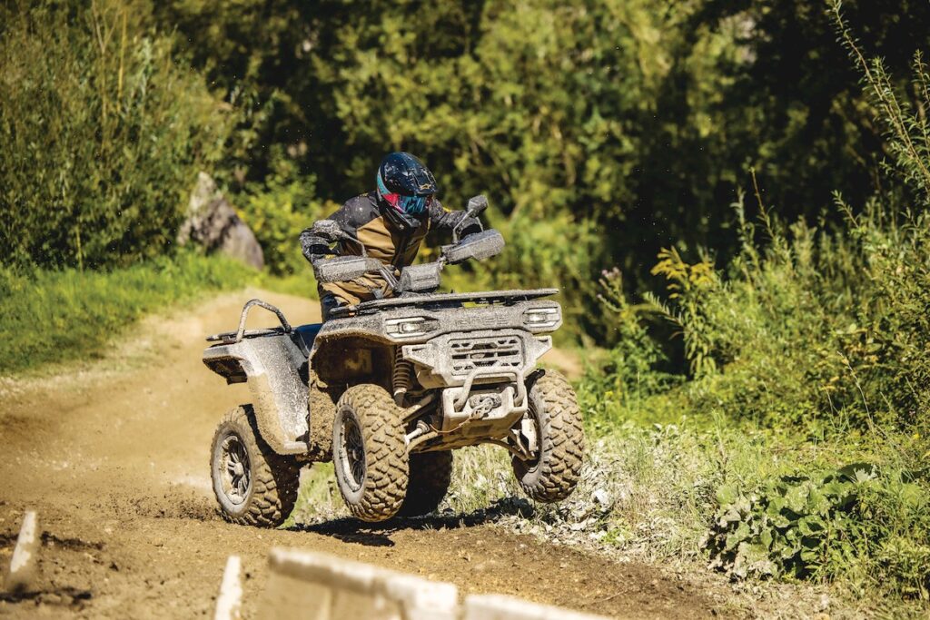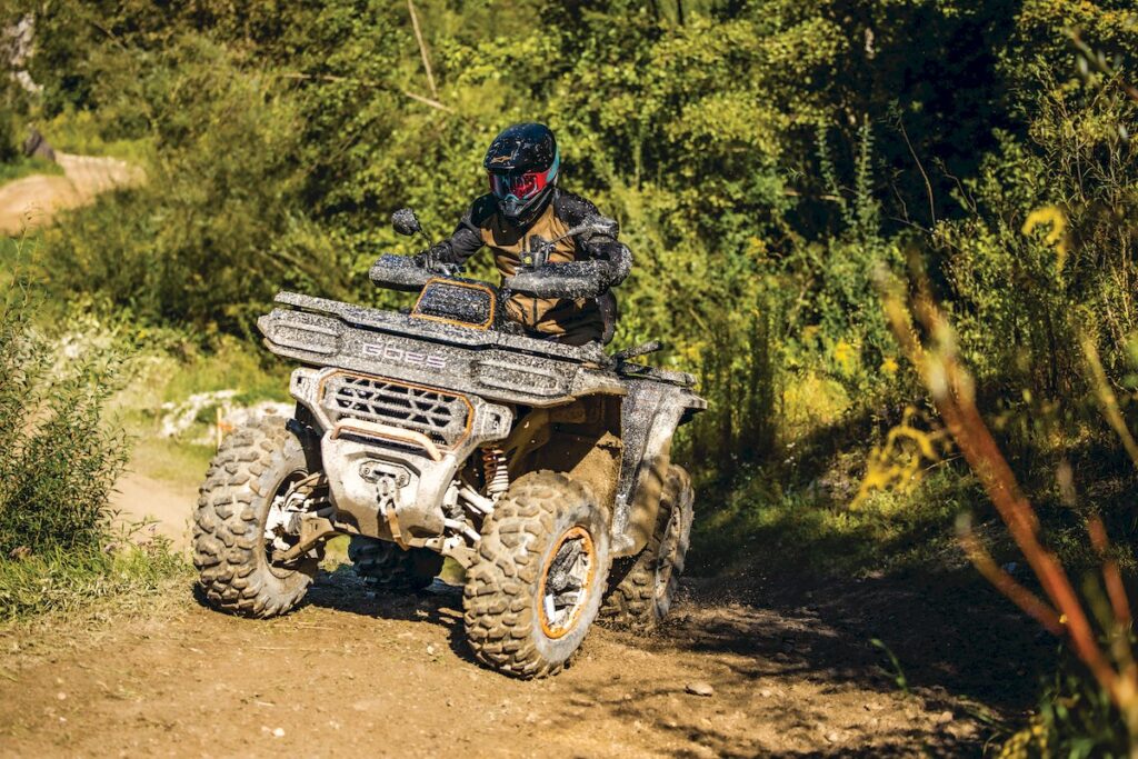 Ao ligar o motor, o som é encorpado e não notámos quaisquer vibrações. A caixa de velocidades CVT permite uma condução suave e bem operada mostra-se muito fácil de escolher entre a posição L,H,N, R e P sem nunca esquecermos de travar com o pé no pedal direito para que as mudanças entrem de forma suave e não “à bruta”. O conjunto mostra-se ideal para quem tem menos experiência ou para aqueles que não pretendem potências desmedidas. Destaque para o sistema de direção assistida EPS (Electronic Power Steering) que funciona muito bem. Temos uma total sensação de controlo, mesmo nos terrenos mais acidentados. Permite-nos o erro e ajuda-nos a compensá-los. A suspensão independente nas quatro rodas, com braços duplos em A, são confortáveis e permitem-nos ajustes na pré-carga das molas, mas para os utilizadores mais experientes, que gostam de rodar rápido, requerem alguma atenção por serem demasiado permissivas. Ganha-se em conforto, perde-se em firmeza desportiva. No entanto, não podemos esquecer que este é um ATV utilitário, pelo que a suspensão está pensada para o conforto! E neste capítulo, não temos nada a apontar: postura de condução direita, guiador bem colocado e dimensionado e um assento amplo em qualquer versão.
