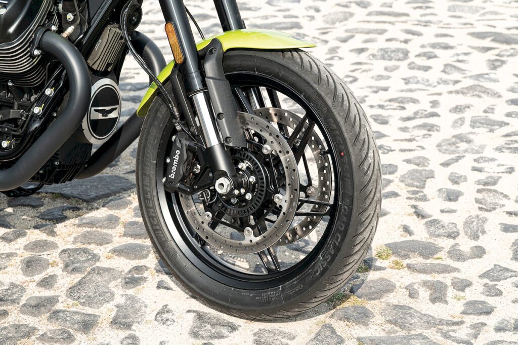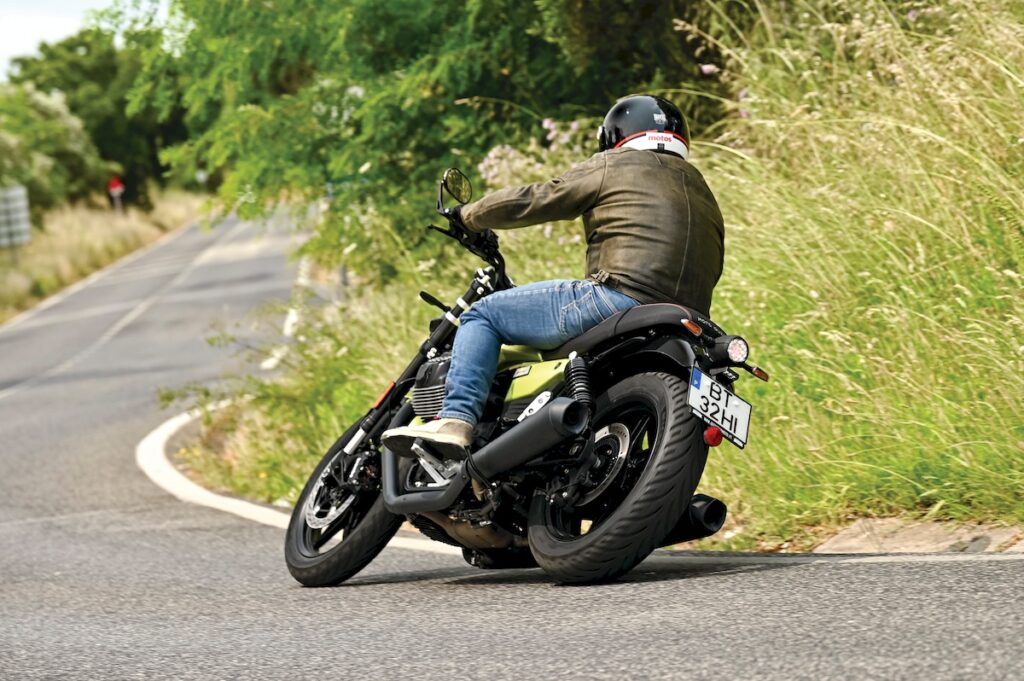 É verdade que no conjunto se sentem algumas (parcas) vibrações, que até dão carácter à Sport, mas as vibrações que aqui falamos, são as “boas vibrações” que a nova V7 Stone tem para dar e vender. Continua a ser um daqueles modelos que sentimos compactos e maciços com algum peso associado, mas o facto de termos o assento colocado a apenas 780 mm do solo, permite-nos apoiar ambos os pés no chão, transmitindo imediatamente confiança e segurança, até mesmo aos utilizadores menos experientes. A postura de condução, embora mais empurrados para a frente, é a clássica, confortável, com guiador largo que nos dá maior envolvência com a moto. A colocação das pernas é natural e confortável e até mesmo o facto de não ser um exemplo de aerodinâmica é totalmente perdoado neste modelo. Quando colocamos a V7 Sport em funcionamento somos invadidos por aquela sonoridade inconfundível que nos deixa de sorriso no rosto e aos tradicionais “clanks” da caixa de seis velocidades, que continua a mostrar-se um pouco rija e com funcionamento muito mecânico, mas bem escalonada.