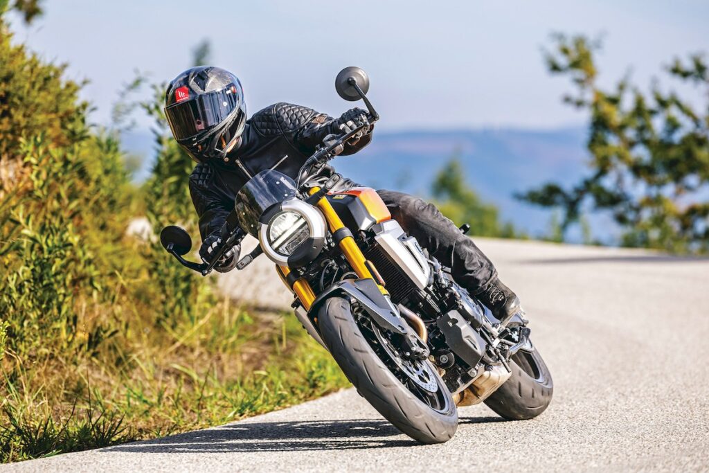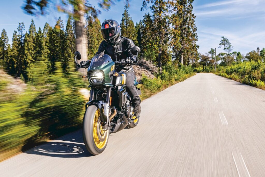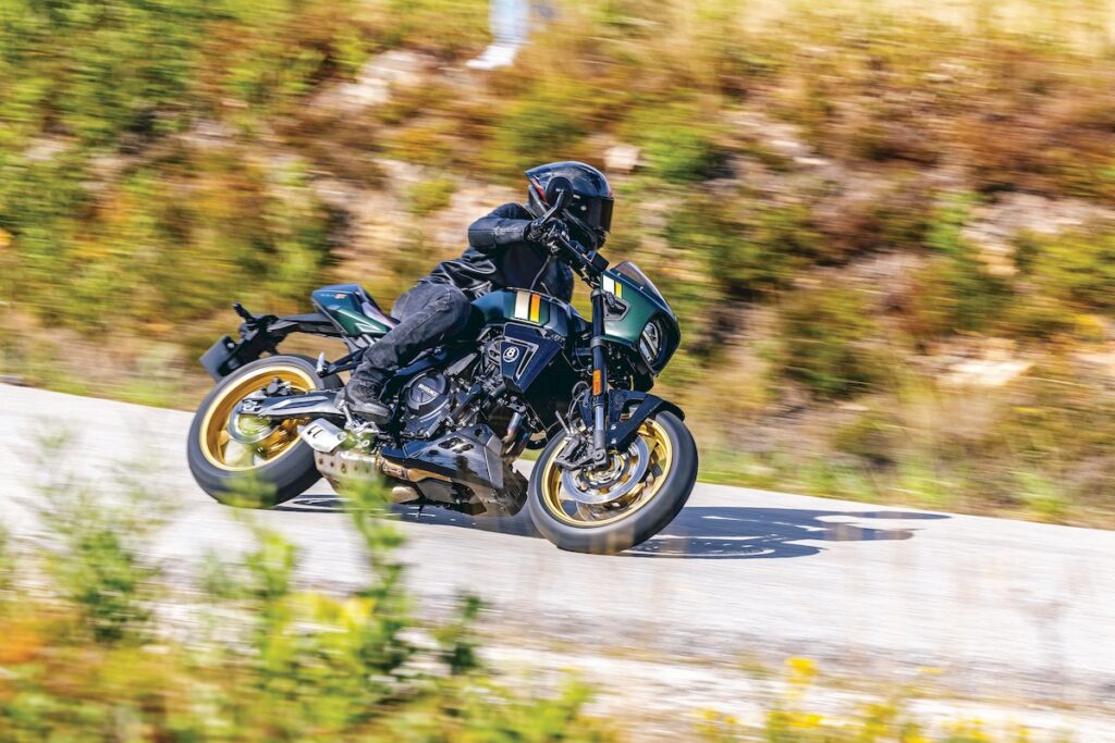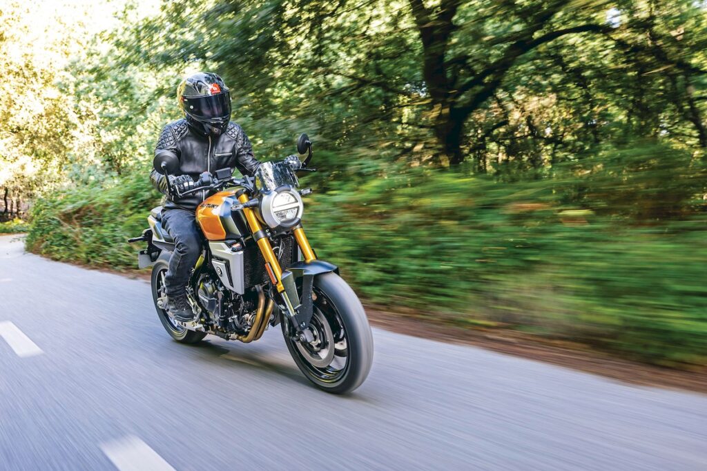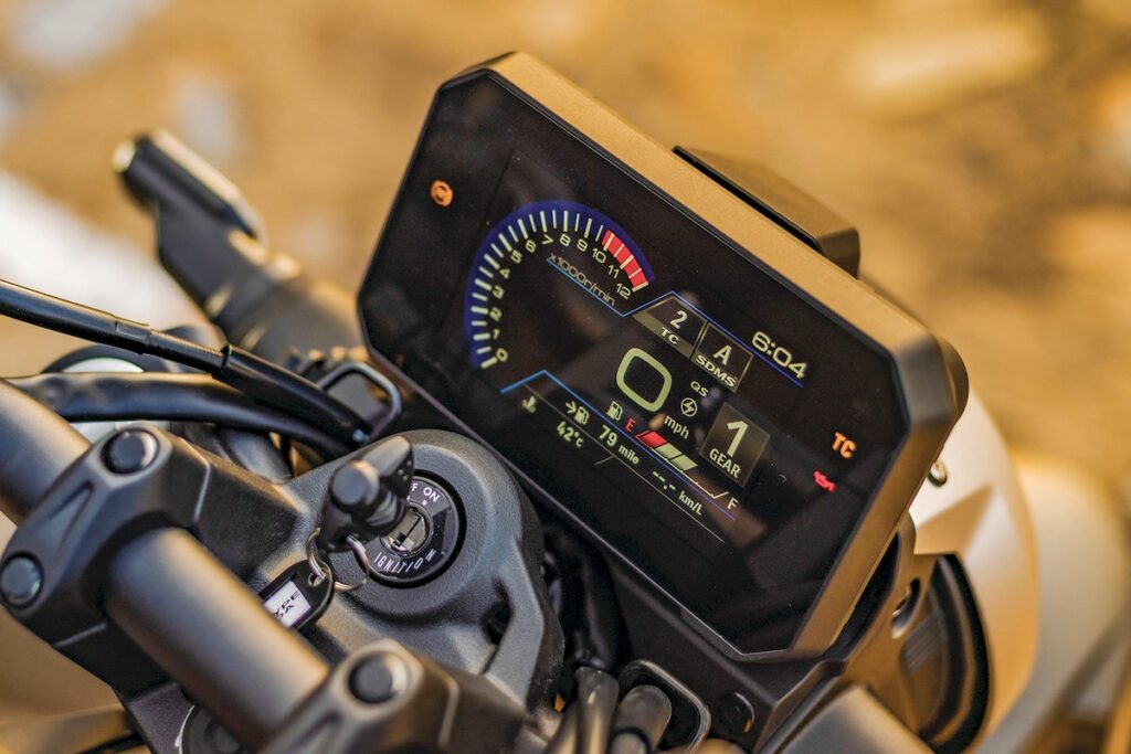 O coração bicilíndrico paralelo manteve-se inalterado, com 776 cc e cambota a 270 graus, capaz de oferecer 83 cv às 8.500 rpm e 78 Nm às 6.800 rpm. Mais do que os números, impressiona o carácter, que desde as baixas rotações se mostra cheio, vigoroso e sempre pronto a responder. A entrega é linear, envolvente e acompanhada por uma sonoridade grave que lhe confere personalidade. A caixa de seis velocidades é suave e precisa, com relações bem escalonadas, e um quickshifter bidirecional de série praticamente exemplar neste segmento.