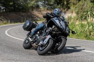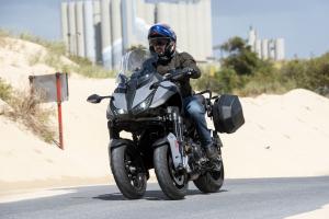Em termos de travagem, é necessário fazer alguma força na manete para parar um conjunto grande em pesado, sendo o shifter da caixa de velocidades um pouco duro, pelo que só o usámos em condução mais desportiva. Mas é claro que apreciámos outras características importantes numa sport turismo, como é o caso dos punhos aquecidos com três níveis, as malas laterais (com bastante arrumação e fáceis de retirar, assim como as suas armações), o cruise control, a presença de um descanso central e uma instrumentação completa com tudo o que é necessário. Tal como nos outros modelos equipados com este motor, o modo de condução 2 (o intermédio) é o mais adequado em grande parte das situações, e falando do tricilíndrico, na Niken nota-se mais o “poço” que ele faz em médio regime, por volta das 4.500/6000 rpm, infelizmente naquela fase em que mais queremos ter motor para sair da curva ou ultrapassar. Normas Euro 4 a fazerem-se sentir, mesmo se em baixos e altos regimes o motor é bem veloz, e sempre com um belo ruído de escape a acompanhar. Também devido ao elevado peso (sempre são 267 kg em ordem de marcha) e dimensões, o consumo de combustível também é mais elevado que na Tracer 900, pelo que registámos uma média de 6,2 l/100 km, sendo difícil andar abaixo dos 6l. Mais detalhes: os espelhos retrovisores estão longe do condutor e nem sempre dão a melhor visão e quando conduzimos com a estrada molhada as duas rodas da frente mandam a água da estrada diretamente para as nossas pernas!