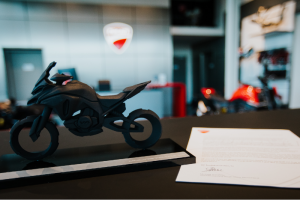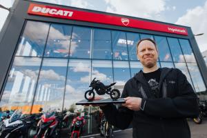 Para celebrar esta ocasião, o Sr. Lebensieg foi convidado pela Ducati Motor Deutschland para o concessionário de Ingolstadt, onde recebeu uma reprodução escultural da Multistrada V4, bem como uma carta personalizada certificando o número de série da moto.