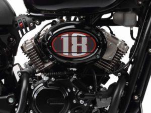 O V agora é a 60º e tem refrigeração liquida e cabeça de 3 válvulas. Uma única árvores de cames move as válvulas do motor que é alimentado por injeção. O novo fltro de ar oval está do lado direito de corado com o número 18 e de muito bom aspeto. Com este novo chassis a moto fica 20 cm mais curta.