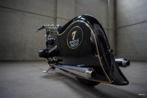 O criador desta maravilha é Dirk Oehlerking, a imagem mais visível da Kingston Customs. Para a fazer, utilizou um motor boxer e travões de uma BMW R75 dos anos 70. O resto foi ele próprio que desenvolveu.