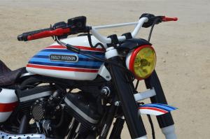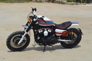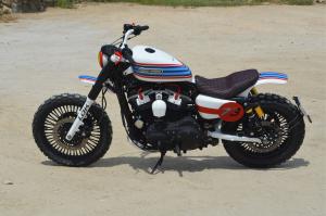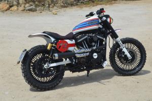 Para rematar, foram instaladas rodas Big Spoke e pneus Continental TKC 80 e que em conjunto com as placas de matrícula laterais feitas à mão e o sistema de escape e filtro de ar específicos, criaram o visual brutal desta Sportster Martini.