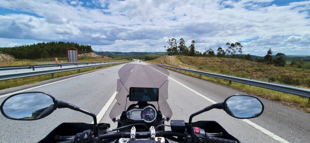 Durante toda a viagem, a moto esteve impecável, como habitual. A Triumph Tiger 800 XCA é daquelas máquinas que dão confiança. Estável, com bom torque, confortável mesmo ao fim de várias horas e preparada para quase tudo. Não é uma pena em termos de peso, mas compensa com tudo o resto. A proteção aerodinâmica ajuda bastante nas estradas mais abertas, e o motor tricilíndrico é um prazer de conduzir, tanto nas subidas como nas retas. É uma moto que não se queixa, nem quando o alcatrão desaparece ou quando há que improvisar, como aconteceu no regresso.
