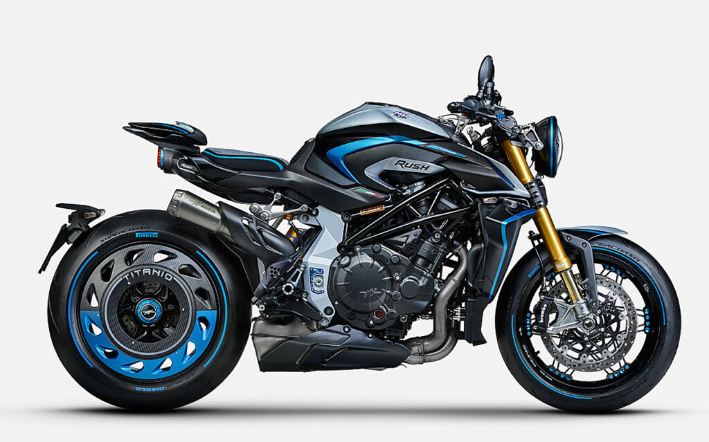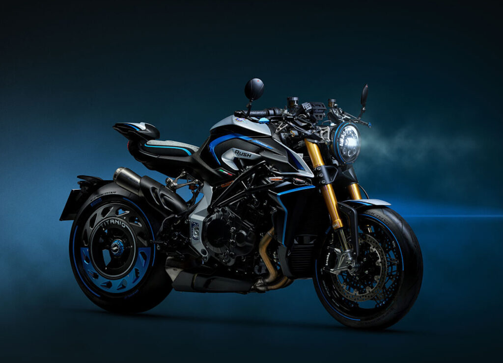 No coração da Rush Titanio reside um motor de quatro cilindros em linha de 1.000 cc profundamente evoluído, concebido para desempenho excecional em toda a gama de rotações. Fabricado artesanalmente em Varese, incorpora uma excelência técnica intransigente, apresentando uma ampla utilização de titânio, incluindo 16 válvulas radiais de titânio e quatro bielas forjadas em titânio.