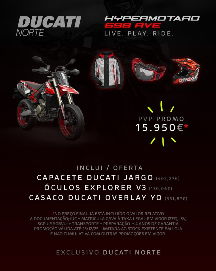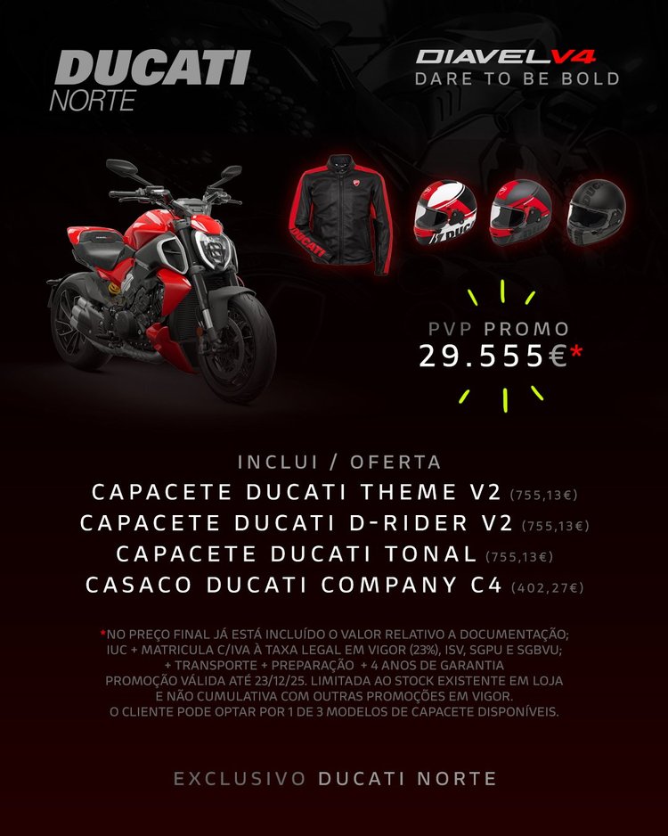 Mas há mais e na Ducati Norte, até ao final do ano, na compra de uma Ducati Diavel V4 o concessionário oferece o capacete e o casaco. Na compra de uma Ducati Hypermotard 698 ou Hypermotard 698 RVE existe a oferta do casaco, o capacete e os óculos. Uma promoção exclusiva da Ducati Norte, limitada ao stock existente e não acumulável com outras campanhas.
