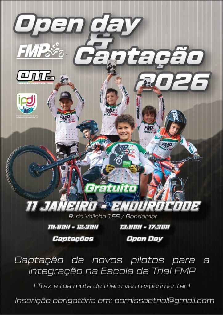 Trata-se de mais uma captação de novos pilotos para a Escola de Trial da FMP, a realizar no dia 11 de janeiro, domingo, ação aberta a todos os jovens entre os 4 e os 16 anos amantes da modalidade e que saibam andar de moto. A captação terá lugar entre as 10h00 e as 12h30.