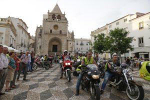 Mototuristas portugueses que não se cansam de apreciar as conhecidas ‘árvores de fraldas’, esses freixos pintados com faixas brancas para maior visibilidade e segurança, e que foram descobrir as pinturas rupestres da Lapa dos Gaviões, deliciando-se com as explicações da arqueóloga da CM de Arronches como com o quadro pré-histórico criado por elementos de um dos muitos motoclubes que deram imprescindível contributo. E, para muitos deles, sobretudo espanhóis (145), franceses (11), suíços (9), polacos (2), alemães (2) e angolanos (2) em pelotão internacional que tinha um representante sueco, um luxemburguês, um macaense e até uma neozelandesa (!) foi também a descoberta de um dos melhores museus interativos de Portugal, o Centro de Ciência do Café premiado em 2015, motivo de orgulho de Campo Maior, a Capital do Café que integra o Grupo Delta. Já a visita à Adega Mayor, investimento mais recente do Comendador Rui Nabeiro com traço do arquiteto Álvaro Siza, fica para próxima ocasião. Que o tempo era de rolar até Elvas, com longas mas pouco monótonas retas de paisagens ‘decoradas’ com gado e onde até algumas lebres fizeram questão de saudar os motociclistas. Uma volta pela cidade, contornando as muralhas que defendem a cidade mais abaluartada do Mundo antecedeu a chegada à Praça da República, exclusivo dos motociclistas durante um quente e trovejante final de tarde.