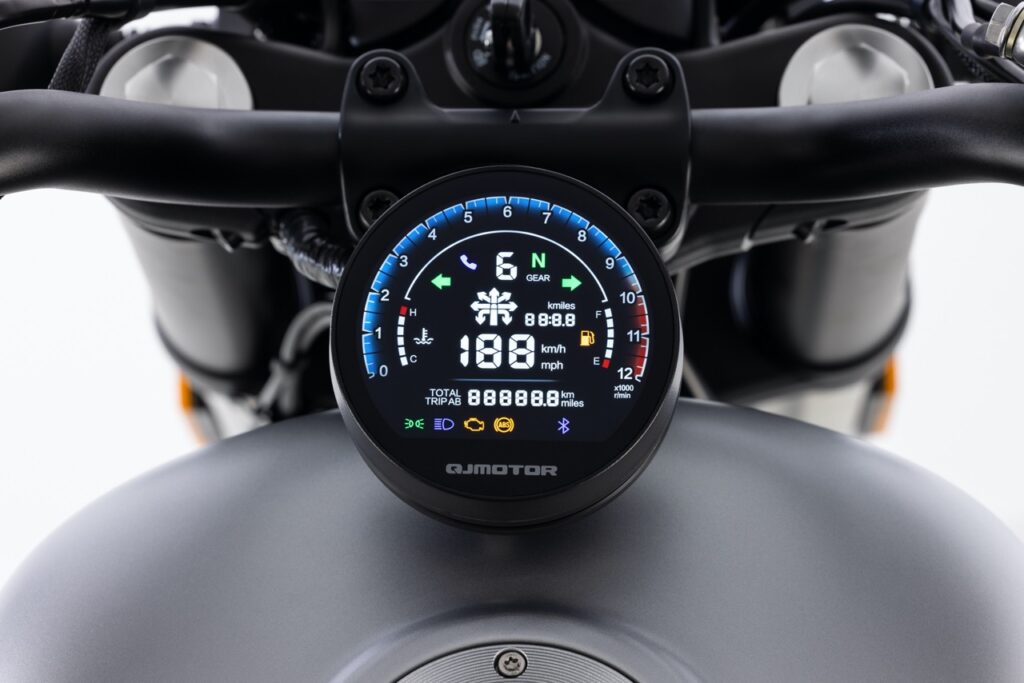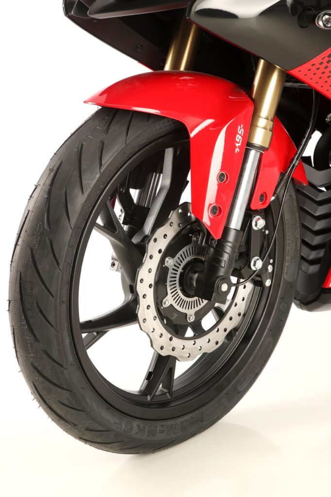 Motor monocilíndrico SOH de 4 válvulas. 125 cc. Potência 15 CV. Iluminação Full LED. Travões ABS de disco tipo “wave”. Painel de instrumentos com ecrã TFT 5″ multifunções. Cores: preto e vermelho. Carta de condução A1.