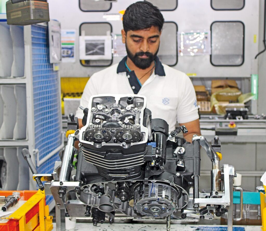 Ao chegar às instalações, fomos recebidos por uma equipa de engenheiros e responsáveis que nos introduziram à história da empresa e nos deram a conhecer o impacto que esta teve na indústria. A Bajaj Auto foi fundada em 1926 por Shri Jamna La Bajaj, quinto filho adotivo de, nada menos que Mahatma Gandhi, e o seu principal lema de vida sempre foi “o bem comum é mais importante que o benefício individual”. Começou com a produção dos famosos “tuk-tuk” e em 1945 deu início ao fabrico de motos. A partir desse momento, e até aos dias de hoje, a empresa não parou de crescer e atualmente conta com 10 000 funcionários em todo o mundo. Com o passar dos anos, sofreu uma grande evolução até se converter numa marca reconhecida em mais de 10 países.