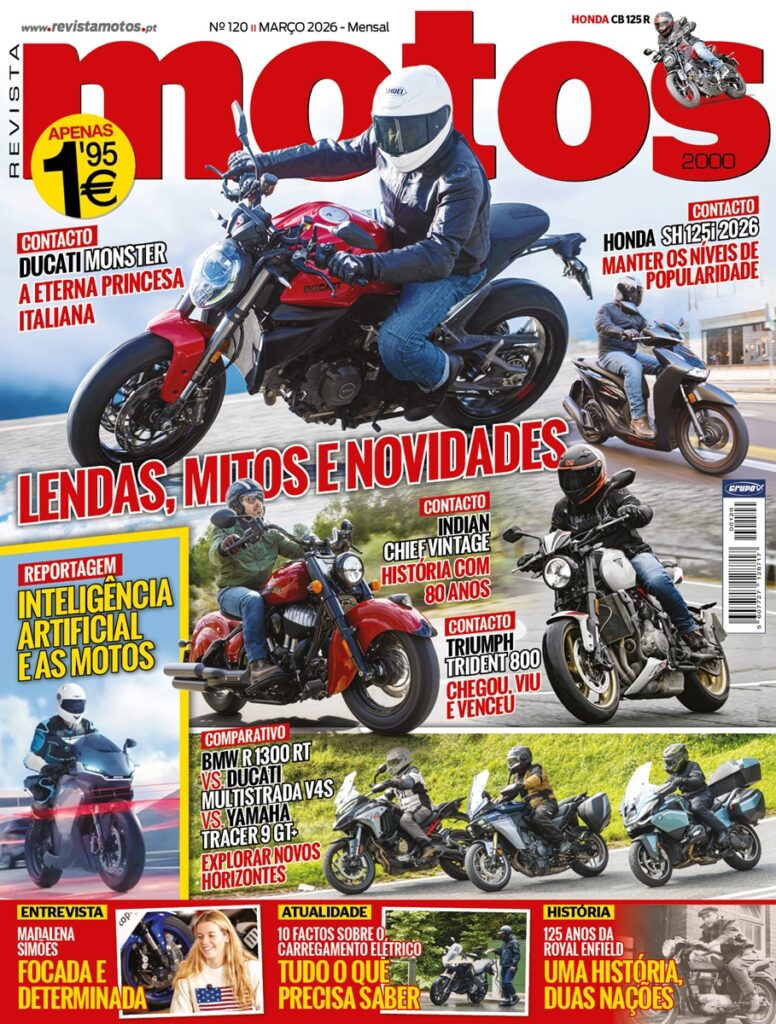Ainda na edição de março testamos a Honda CB125R, contamos a História da Royal Enfield e entrevistamos a jovem piloto Madalena Simões. Finalmente, para os fãs das mais recentes tecnologias, realizamos um trabalho sobre a Inteligência Artificial e as Motos, e ainda damos conta dos principais cuidados a ter com o carregamento de uma moto elétrica. Muitos e bons temas (embora nós sejamos suspeitos), que podem desde já encontrar na banca mais próxima.