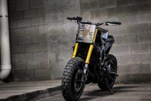 Não porque seja feia, nada disso. Mas pela sua imagem extremamente agressiva e impactante. Parece uma moto do Mad Max. Esta Scrambler, baseada na MT-09 da Yamaha parece que foi feita para arrasar com toda a classe de montros numa plena guerra de escasse por agua. Grande parte da imagem recai sobre os pneus TKC80 de enduro.