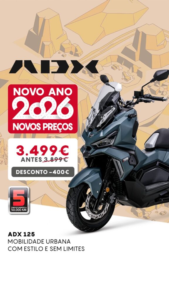 A ADX 125 está neste momento disponível com um desconto de 400€, tendo um PVPr de 3.499€, campanha válida até 30 de junho, limitada a stock existente. Aos preços acima indicados acrescem Despesas de Legalização, Transporte, Eco-valor e quando aplicável, IUC. Disponível em 4 cores, o modelo está disponível na rede de concessionários da marca.