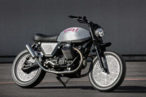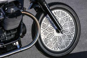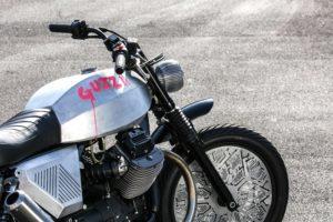 Quanto às suas características, o farol é adaptado de um dos produtos mais famosos de Dixon (a luz pendente “Fin”) e, com traços invulgares, a moto tem também pneus incomuns, que apresentam um padrão de piso de folha moldado em borracha pela Pirelli. Já o tanque é de alumínio e feito à mão, com painéis laterais. Lá, pode ler-se a palavra “Guzzi”, escrita com tinta rosa.
