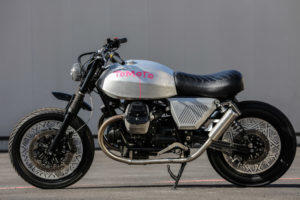 Uma moto Guzzi V7 criada pelo designer britânico Tom Dixon e pelo construtor de motos Stefano Venier. Este projeto tem o nome de ‘Tomoto’ e a moto é um protótipo único que não está à venda nem será replicado.