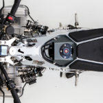 E foi aqui que teve início o verdadeiro trabalho deste engenheiro, construir um chassis minimalista ao redor deste grande motor, com a obsessão acrescentada de incorporar uma suspensão dianteira tipo Harrier, com dois braços e dois amortecedores, que no caso são de uma Guzzi V7 e cumprem na perfeição com o seu trabalho.